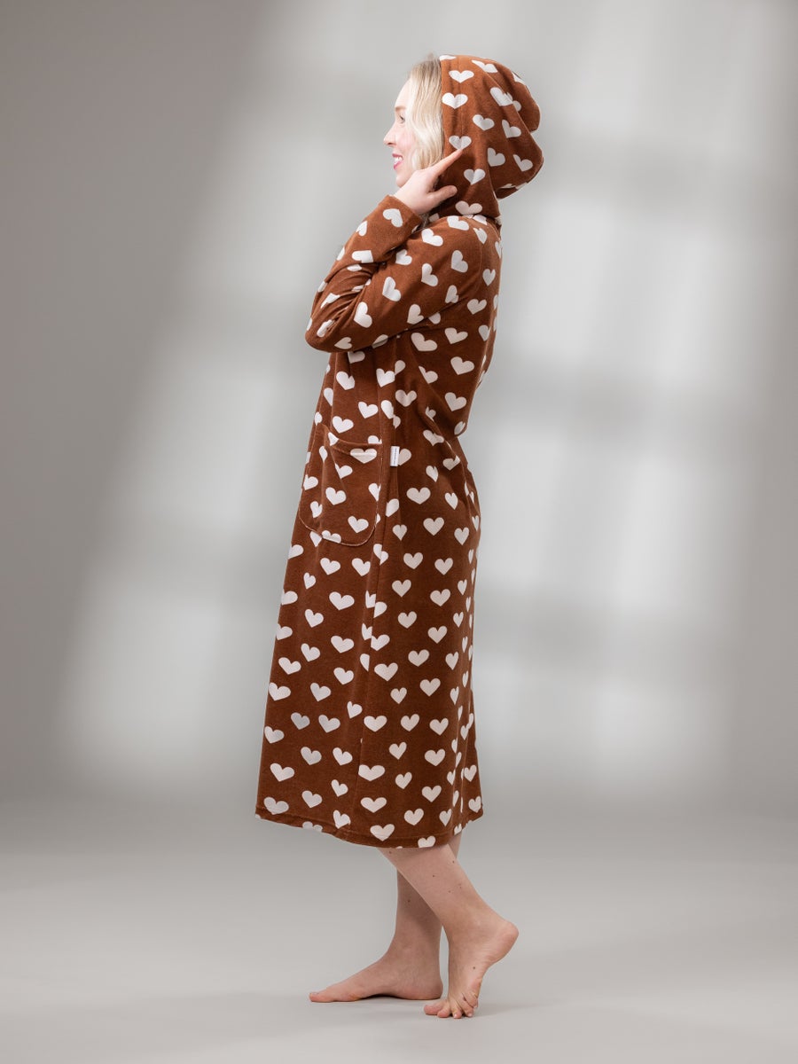 The SAUNAtakki is one of Versonpuoti's first products and it is also our most beloved and popular item. According to numerous reviews, it has become a loungewear essential that our customers don’t want to live without. It's worn during cozy home moments, sauna evenings, cleaning days, when unexpected guests arrive, and even on shopping trips. Many have also bought one for their cottage or camper to ensure their favorite garment is available during vacations as well. Comfortable stretch terry material, striking patterns, long hem length, easy-to-use zipper, large pockets for carrying various items, and a hood for added warmth when needed are the reasons why our SAUNAtakki is so popular on loved item!