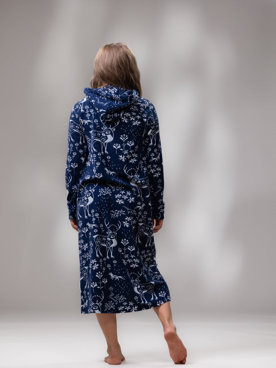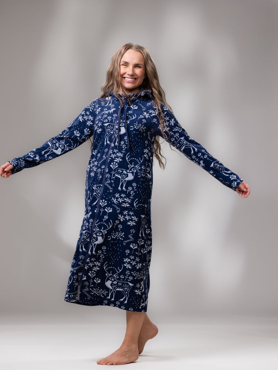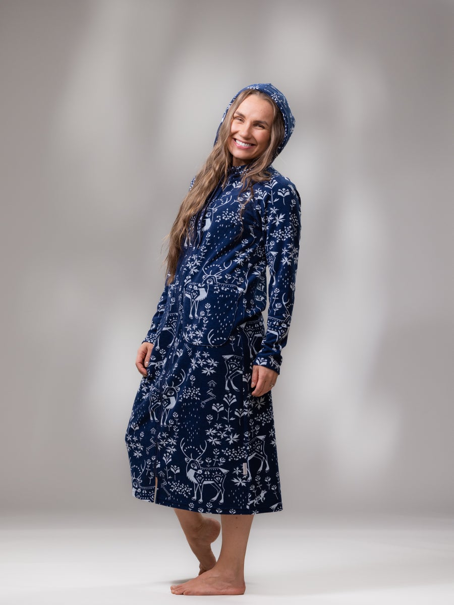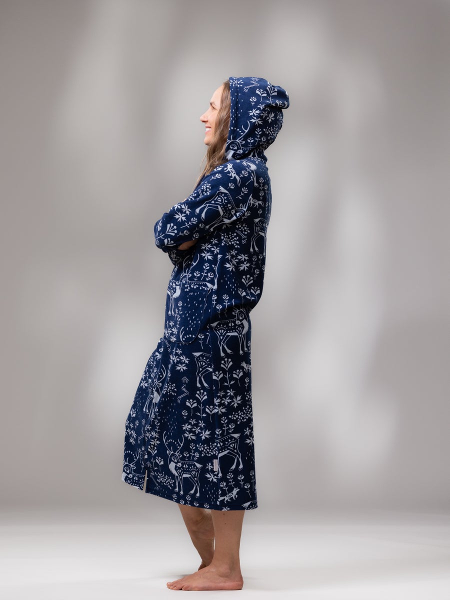 The SAUNAtakki is one of Versonpuoti's first products and it is also our most beloved and popular item. According to numerous reviews, it has become a loungewear essential that our customers don’t want to live without. It's worn during cozy home moments, sauna evenings, cleaning days, when unexpected guests arrive, and even on shopping trips. Many have also bought one for their cottage or camper to ensure their favorite garment is available during vacations as well. Comfortable stretch terry material, striking patterns, long hem length, easy-to-use zipper, large pockets for carrying various items, and a hood for added warmth when needed are the reasons why our SAUNAtakki is so popular on loved item!